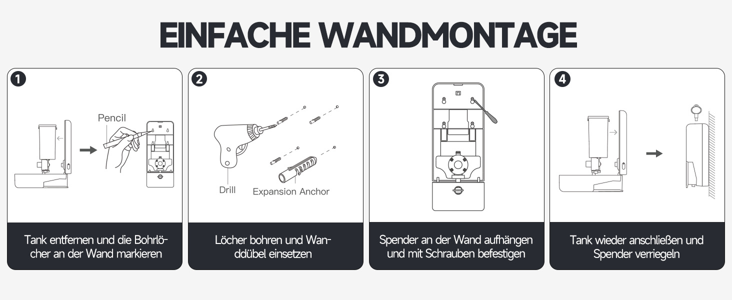 Die Montage des Seifenspenders ist kinderleicht. Innerhalb von nur 30 Sekunden kann er mit den mitgelieferten Edelstahlschrauben und einem Laser-Sticker an Fliesen oder Holz mit einer Dicke von 5-25 mm befestigt werden, ohne dabei Schäden zu verursachen. Der schwerere Boden sorgt dafür, dass der Spender nicht umkippt, selbst bei häufigem Gebrauch, und somit eine stressfreie Anwendung garantiert.