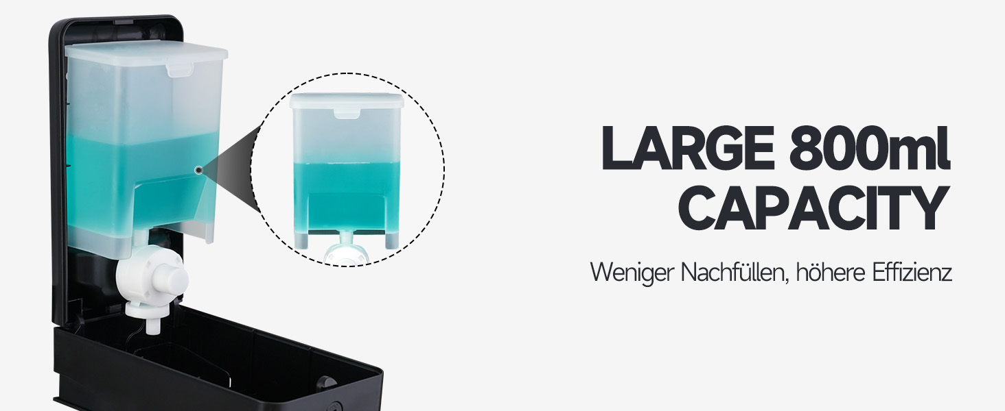 Mit einem Fassungsvermögen von 800 ml bietet dieser Seifenspender genug Nachschub für bis zu drei Wochen bei einem Haushalt mit vier Personen. Im Vergleich zu den 300 ml Spendern der Konkurrenz unterstützt unser Produkt eine umweltfreundliche Nutzung. Das Nachfüllen erfolgt über einen 4,5 Zoll breiten Hals mit recycelbaren Beuteln, was den Plastikmüll um 80% reduziert und somit einen wertvollen Beitrag zur Umwelt leistet.
