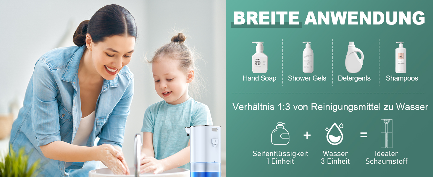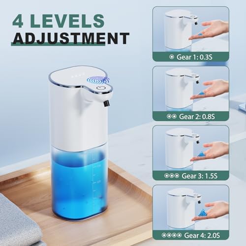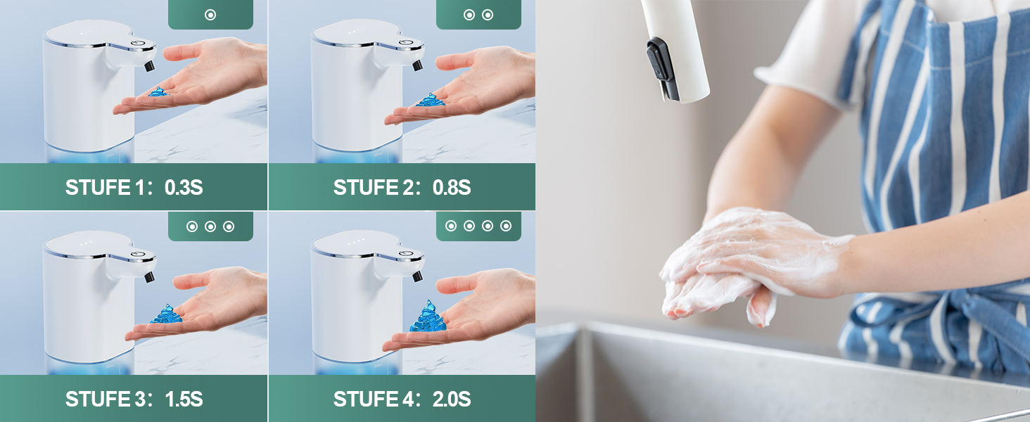 Der Seifenspender bietet eine bemerkenswerte Flexibilität mit vier einstellbaren Dosierungsoptionen (0,3 Sekunden, 0,8 Sekunden, 1,5 Sekunden und 2,0 Sekunden). Sie können die Flüssigkeitsmenge nach Ihren persönlichen Bedürfnissen anpassen, was nicht nur hilft, Kosten zu sparen, sondern auch den Abfall zu reduzieren – eine umweltfreundliche Wahl für Ihr Zuhause.
