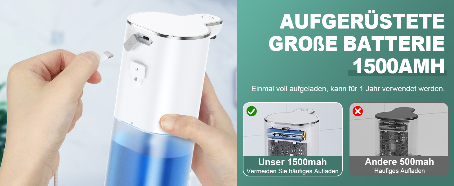 Der elektrische Seifenspender ist mit einer langlebigen und leistungsstarken 1500mAh-Batterie ausgestattet, die nicht ausgetauscht werden muss. Diese versiegelte Batterie schützt vor Nässe und Rost, was die Langlebigkeit des Produkts erheblich erhöht. In nur 3 Stunden ist der Seifenspender vollständig aufgeladen und bietet eine Einsatzdauer von beeindruckenden 8 bis 12 Monaten.